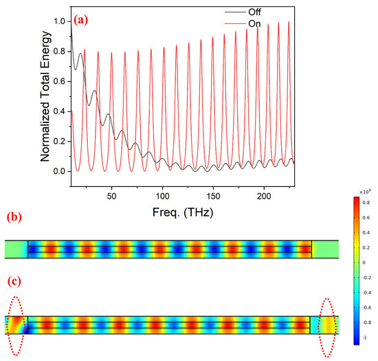 In the presence of air as the surrounding material of the sensor (a) plot of normalized energy density for the range of frequencies for the on (red) and off (black) states, which can be respectively translated as the conductive and insulator forms of VO2. Demonstration of modulation capability was made from the z-component of the surface electric field while VO2 in (b) the conductive phase and (c) the insulated phase, where at the location of dotted circles, leakage of the electric field can be seen.