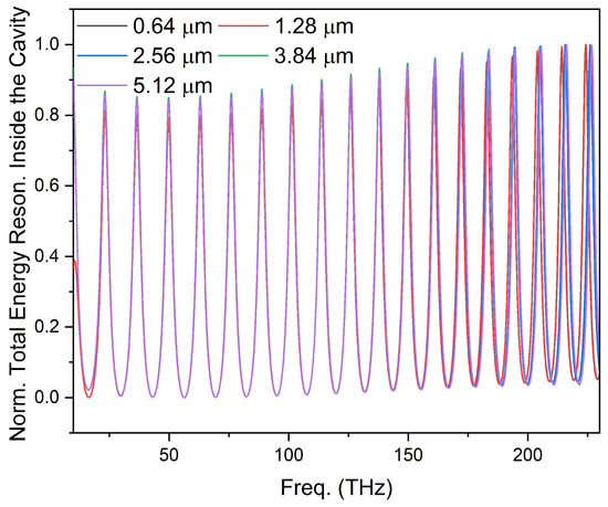 In the first scenario, the thickness of the VO2 layer was gradually varied from 0.64 μm to 5.12 μm and a corresponding effect on the resonating modes was investigated. The resulting mode pattern, as obtained for the different thickness of the VO2 layer, was plotted in Figure 4. As shown in Figure 4, it was observed that the increase in the thickness of the VO2 layer on each side of the Si waveguide has little or no effect on the resonating modes. Hence, its effect can be neglected. The light bounces back and forth between two VO2 layers inside the Si waveguide and encounters change in RI only once on each side of the waveguide, in contrast to the periodic variations of RI commonly observed in Bragg gratings or reflectors. For all the other analysis of our optical resonator RI sensor model, 1.28 μm was taken as the standard thickness of VO2 layer. The investigations were also made to study the detailed influence of the cavity’s length on resonating modes by considering FSR and Q-factor calculated from Equations (3) and (4), respectively, as standards.