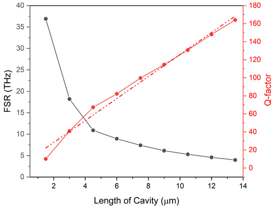 The Q-factor serves as a figure of merit for any optical resonator and provides information about the losses of the cavity. An optical cavity with a lower loss will have a correspondingly higher Q-factor and the light will be able to make an increased number of round trips while sampling the analyte of interest each time before finally exiting the resonator. Both the higher number of round trips and the light-sample interaction translates itself in terms of higher sensitivity and resolution of the optical sensor. An optical resonator sensor with a high FSR has a well-differentiated resonance mode signal and can detect small changes in the concentration [73,74,75]. In the case of our proposed FP-type linear resonator-based RI sensor, as its length varies, resulting in an increase in Q-factor at the expense of reduced FSR, as governed by Equation (2). The relationship between Q-factor and FSR for different lengths of the cavity has been presented graphically in Figure 5. For the sake of achieving higher sensitivity with a reasonable FSR and Q-factor, the length of the linear optical resonator sensor was selected as 3.84 μm. This is a parameter given by the cross-point between FSR and Q-factor curve.