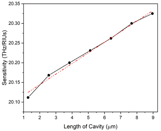 From Equation (2), the change in external RI of the medium surrounding the optical resonator manifests itself in the form of an increase in effective RI of the resonating modes, and hence, a change in their position. As can be seen in Figure 6, for the presented linear FP-type RI sensor with a length of about 3.84 μm, we observed the blue shift in the frequency spectrum for the increase in the real part of the external RI. The slope of the linear fit for the total shift in resonant mode location for the whole change of external RI provided the sensitivity. The recorded sensitivity for the real part of the RI sensor was 20.2 THz/RIUs or 179.56 nm/RIU. This sensitivity value is almost 20 times higher than the one reported by the G.P Papari et al. [37]. In the literature, G.P Papari et al. [37] presented an experimental study on an optical sensor system. The experimental and analytical results in that study show similar trends to our work, which include switching (conductor–insulator) behaviour of VO2, change in FSR and Q-factor of the cavity with changes in the cavity’s length, and change in resonant peak location with a change of the external RI. These findings support the validity of the computational work on modelling of our sensor. This recorded increase in sensitivity can be attributed to the following: (i) the use of dielectric Si waveguide to reduce the FWHM of the resonating modes by mitigating the optical cavity losses that are caused by issues such as attenuation or scattering, as in the case of air; (ii) proper guiding of light in the Si-based aligned optical cavity instead of the free space optical cavity where a minor misalignment of VO2 end reflectors can cause enhanced optical losses affecting Q-factor (iii) Improved Q-factor and longer FSR, respectively, due to lesser intrinsic losses and reduced length of the linear optical cavity resonator. Similarly, a decrease in the surface electric field norm and an increase in the evanescent field was recorded for the rising external RI, as shown in Figure 6c,d. This, in turn, leads to stronger light–matter interaction. The sensitivity of the reported optical resonator RI sensing model displayed the direct relation with its length as shown in Figure 7. This is because of the increase in Q-factor with cavity length, as presented in Figure 5, which enabled the light to sample the analyte of interest many times before finally exiting the optical resonator.