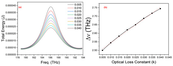 The concentration of mixtures with a single unknown parameter, such as binary mixtures, can be sensed by optical sensors capable of detecting changes in the real part of the refractive index (RI). But for the case of two unknown parameters as they apply to ternary mixtures, this technique is not useful anymore. For determining the concentration of such mixtures, a more complex and sophisticated method such as functional group immobilization is used. This, in turn, renders the optical sensing system less sensitive and adds to its final cost under the fold of materials used for the surface functionalization of the sensor [76,77]. In the literature, it is established that each of the individual components making up a ternary mixture, having the same real part, has different imaginary parts [78,79].This basic principle was used to test the ability of the proposed broadband optical sensor to detect ternary mixtures. While keeping the real part n of the complex external RI fixed at 1.36, the optical loss constant k, or imaginary part of it, was changed in equal steps from 0.035 to 0.01. The linewidth of the resonating cavity mode at FWHM, calculated by applying Lorentzian fitting, showed an increase. The increase in can be attributed to an increase in cavity losses with the increase in the optical loss constant k for the surroundings of the sensor. Figure 8a shows the increase in of the mode for different values of the optical loss constant k. The plot in Figure 8b, which shows the change in FWHM of the resonating mode found from Lorentz fitting against k, demonstrates that the increase in is almost linear. This provides an imaginary part sensitivity of 6.94 THz/RIUs, which is equivalent to 59.96 nm/RIU. Therefore, the reported sensor is equally capable of detecting ternary mixtures without the need for any surface immobilization methodology. The sensitivity comparison of our modeled sensor with the devices reported in the literature can be seen in Table 2.