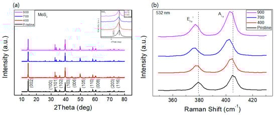 Figure 1a shows the single-phase XRD patterns of pristine MoS2 and MoS2 compound samples annealed at 400, 700, and 900 °C. The patterns indicate 2H phases (P63/mmc). The redshifts of 0.04 degrees in phases in the (002) peak in the annealed MoS2 samples for the pristine MoS2 are observed. The enlarged zone of the (002) peak is shown in the inset of Figure 1a for a better comparison. The positions of all the peaks in the three annealed samples are the same, whereas the intensity of the samples is slightly different. This means that the annealing has little influence on the structure of the MoS2 compound, and the structural stability is valid for the temperature variation.