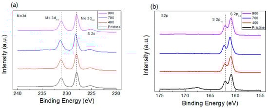 XPS is a sensitive and useful tool to identify the electronic structure such as chemical composition and stoichiometry of chemical materials like MoS2 compound. Figure 2 shows the core level spectra, demonstrating the binding energy profiles for Mo 3d and S 2p elements of MoS2 compound. Three peaks of the XPS spectra, depicted in Figure 2a, recorded at 231.12, 228.01, and 225.09 eV for the pristine MoS2 compound are assigned to the Mo 3d3/2, Mo 3d5/2, and S 2s, respectively. The positions of these peaks indicate a 4+ valence state of Mo from pure MoS2 phase, which agrees with another study conducted for MoS2 crystals []. Compared to the pristine MoS2 compound, all annealed compounds indicate no peak shift in binding energy except the 700 °C-annealed sample. It means that the redistribution of the localized charges, owing to the formation of sulfur vacancies, happens only in the 700 °C-annealed sample; sometimes, the introduction of unpaired electrons caused by vacancy generation produces charge redistribution [], an n-type doping effect, in MoS2. However, there is no doping effect in the electronic structure of XPS spectra except the 700 °C-annealed sample. We hypothesize that this may cause a sensitivity problem of XPS for different samples. In Figure 2b, a similar tendency is shown for S 2p1/2 and S 2p3/2 doublet states, with the binding energy of ~162.02 and ~160.85 eV, respectively.