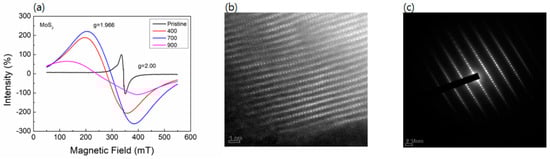 The TEM measurement was carried out for the estimation of single crystal properties and the existence of vacancy in samples. Figure 3b,c show the TEM image and the SAED pattern of the 700 °C-annealed sample compound. These indicate that the MoS2 compound is a single crystal, and some vacancies are shown by dark points, according to lattices in images. Therefore, the observations made based on EPR results are consistent with the TEM data.