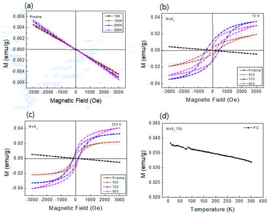 M-H characteristics of the pristine and annealed MoS2 compounds from low-to-room temperatures acquired using SQUID. (a) Pristine, (b) 10 K, (c) 300 K, and (d) M-T (FC) curve of the 700 °C-annealed sample.