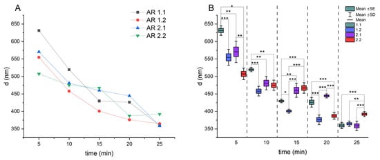 (A,B) Hydrodynamic averaged diameter (dH) of microwave-treated silicas depending on sonification time (t) without (A) and with (B) statistically significant differences (* p < 0.05; ** p < 0.01; *** p < 0.001). Data shown directly after sonication (t = 0 day).