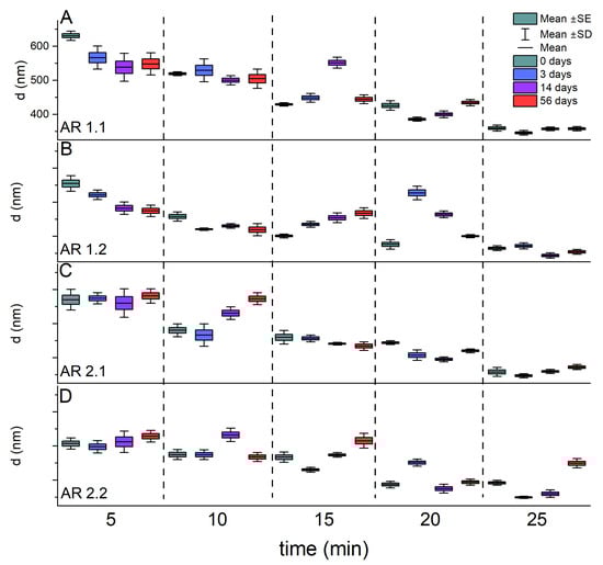 (A–D) Hydrodynamic averaged diameter (dH) dependence of sonification time (t) for (A) AR 1.1, (B) AR 1.2, (C) AR 2.1, (D) AR 2.2 during storage up to 56 days.