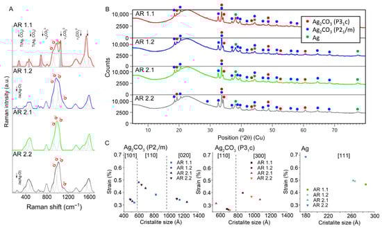 (A) Raman spectra, (B) XRD patterns, and (C) crystallite size and strain of the silver phases within the Ag-SiO2 nanocomposites. Individual colors on all figures correspond to the individual composites. Dash-line Raman spectra represent the silica, while the straight-line spectra represent the silver carbonate.