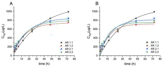 Exponential fits prove highly effective in describing the experimental data for all investigated silicas, facilitating the determination of constant rates for the depletion of free silver ions in the solution or the accumulation of ions within the porous carrier. Detailed analysis reveals sorption capacities ranging from approximately 1 to 6 ppm over 40 to 70 h, contingent on microwave field power or time. Silicas exposed to higher microwave power (AR 1.1 and AR 1.2) exhibit twice the higher sorption capacity of those subjected to a lower microwave field (AR 2.1 and AR 2.2) (Table 4). Conversely, achieving higher capacitance necessitates a considerably longer time for complete pore saturation (Table 4).