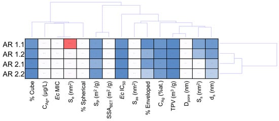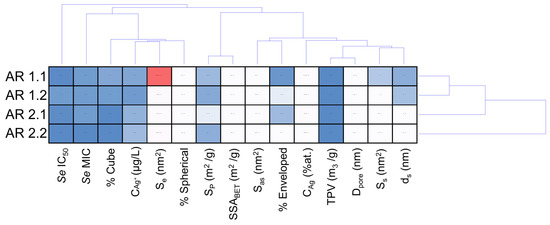 Data were statistically treated and presented as mean ± standard deviation values (mean ± SD). The statistical significance was followed using a one-way ANOVA and Tukey’s honest significant difference test (HSD). The substantial variations in experimental groups were represented in figures by annotated letters as p < 0.05 (*), p < 0.01 (**), and p < 0.001 (***) levels of significance. All experimental data were subjected to multivariate analysis. Hydrodynamic particle size was graphically presented using box-and-whiskers graphs. In turn, the multifaceted microbial analysis covering various aspects related to the features of silver nanoparticles and global silver–silica nanocomposites was performed using hierarchical cluster analysis (HCA) and summarized with the heat map. For this analysis, the data obtained were normalized according to Equation (3) []: