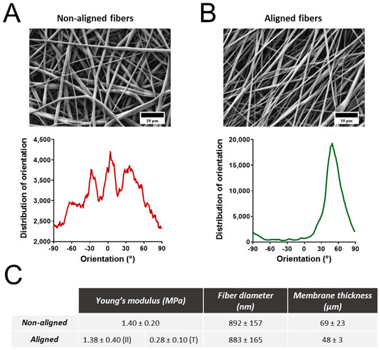 Characterization of non-aligned and aligned polyurethane electrospun fibrous membranes. Scanning electron microscopy images and fiber orientation of non-aligned (A) and aligned fibers (B). Tables presenting information regarding the Young’s modulus, average fiber diameter, and membrane thickness (C). Data are presented as the mean ± standard error of the mean. II—fibers along the strain direction; T—fibers perpendicular to the strain direction.