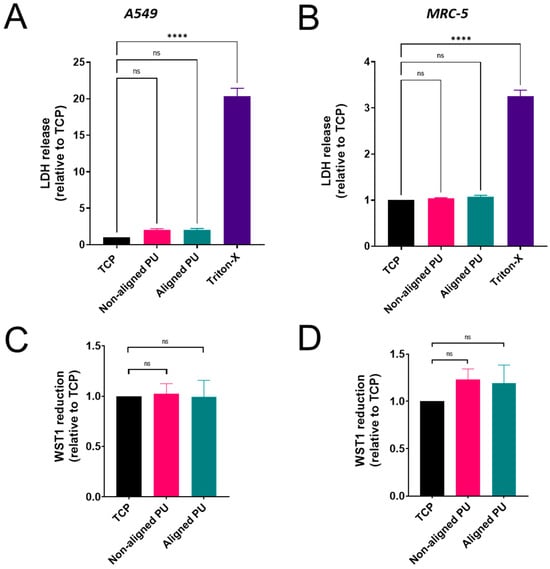 Impact of fibrous polyurethane (PU) membranes on the cytotoxicity and metabolic activity of lung epithelial cells (A549) and fibroblasts (MRC-5). Bar graphs, at the top, represent the release of lactate dehydrogenase relative to tissue culture plastic (TCP) from A549 (A) and MRC-5 (B) cells. Bar graphs, at the bottom, represent the reduction in WST-1 relative to TCP from A549 (C) and MRC-5 (D) cells. Absorbance values for the WST-1 assay were normalized against the total protein content. Data are presented as the mean ± standard error of the mean (n = 3). Statistical significance was determined via one-way ANOVA and Dunnett’s post hoc test for multiple comparisons and is represented by **** p ≤ 0.0001. ns: not significant.