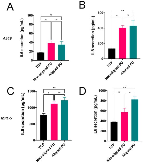 Impact of fibrous polyurethane (PU) membranes on the inflammatory response of lung epithelial cells (A549) and fibroblasts (MRC-5). Bar graphs represent the release of interleukin (IL)-6 and IL-8 from A549 (A,B) and MRC-5 (C,D) cultured on tissue culture plastic (TCP) and non-aligned and aligned PU. Values were normalized against the total protein content. Data are presented as the mean ± standard error of the mean (n = 3). Statistical significance was determined via one-way ANOVA and Tukey’s post hoc test for multiple comparisons and is represented by * p ≤ 0.05 and ** p ≤ 0.01. ns: not significant.
