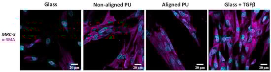 Immunofluorescence staining for α-smooth muscle actin (α-SMA). Confocal laser scanning microscopy (CLSM) images showing the immunostaining of MRC-5 fibroblasts with α-SMA cultured on glass, non-aligned and aligned polyurethane (PU) fibers, and glass + transforming growth factor beta (TGF-β). TGF-β was added for 24 h to MRC-5 cells at a concentration of 5 ng/mL. Nuclei are in cyan and α-SMA is in magenta.