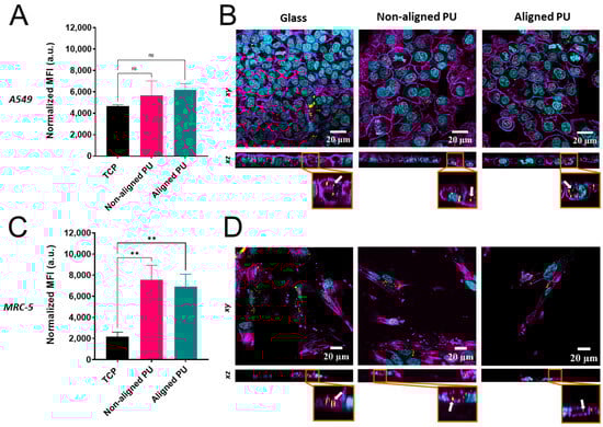 Impact of fibrous polyurethane (PU) membranes on SiO2 nanoparticle (NP) uptake in lung epithelial cells (A549) and fibroblasts (MRC-5). Bar graphs show the median fluorescence intensity (MFI) values obtained from flow cytometry measurements upon 24 h of exposure of 20 µg/mL SiO2 NPs to A549 (A) and MRC-5 cells (C) cultured on tissue culture plastic (TCP) and non-aligned and aligned PU fibers. Data are presented as the mean ± standard error of the mean (n = 3). Statistical significance was determined via one-way ANOVA and Dunnett’s post hoc test for multiple comparisons and is represented by ** p ≤ 0.01. ns: not significant. Confocal laser scanning microscopy (CLSM) images showing the internalization of SiO2 NPs in A549 (B) and MRC-5 cells (D) cultured on glass and non-aligned and aligned PU fibers. Nuclei are in cyan, F-actin is in magenta, and SiO2 NPs are in yellow. Arrows indicate the intracellular localization of NPs.