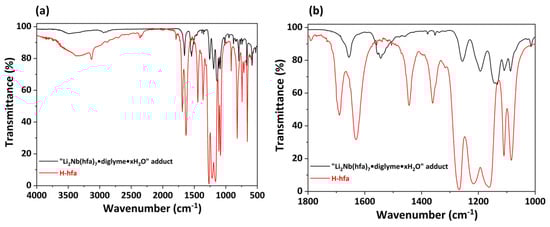Comparison between the ATR/FT-IR spectrum of the “[Li2Nb(hfa)7•diglyme•xH2O]” adduct (black line) and the Hhfa neat sample (red line) (a) and an enlarged region between 1000 cm−1 and 1800 cm−1 (b).