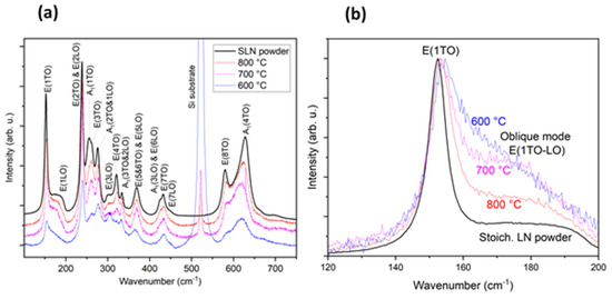 To gain further insights, additional characterizations were conducted. Specifically, a Raman study was performed on the samples deposited on silicon substrates and annealed at 600 °C, 700 °C, and 800 °C. It is known that the LiNbO3 crystal belongs to the R3c space group (Z = 2) at room temperature with 4A1 + 9E + 5A2 optical modes. Only the A1 and E modes are Raman-active [67]. We investigated how different annealing temperatures influenced the Raman spectra, as presented in Figure 5a. The Raman spectra of synthesized polycrystalline films were compared to that of stoichiometric LN powder Raman modes and identified according to the assignment given in Ref. [67]. Notably, the phonon modes observed in the film spectra closely resemble the equivalent modes observed for stoichiometric LiNbO3 powders. No additional modes were observed, indicating that the film is composed mainly of a single LiNbO3 phase and that the additional impurity phase, observed in XRD patterns, could be segregated locally [68]. In fact, while micro-Raman spectroscopy is a punctual analysis with a much smaller analyzed area, the XRD measurement in grazing incidence analyzes a large area of the films. The wavenumbers of observed modes with highest intensity were compared to those reported for the single crystals (Table 2). It is important to note that fundamental Raman modes are present together with quasi-/oblique modes due to angular dispersion of crystallite orientation in LN polycrystalline samples [69]. This introduces the mode wavenumber deviation from those observed in the single crystal samples. Nevertheless, the mode wavenumbers remain relatively close to those measured for single crystals and agree very well with the measured intensity ratios and the wavenumbers of the Raman modes in the stoichiometric LN powder. It is known that the E(6TO) mode is particularly sensitive to the residual stresses in the LN films [70]. The films sintered at 700 °C and 800 °C present the E(6TO) mode with a very close wavenumber to that of stress-free powders. This indicates minimal mechanical stress within the films. One can note that LN films crystallized at 600 °C present less defined Raman mode profiles, indicating lower crystalline quality/higher defect concentration than films annealed at 700–800 °C. The widths/dampings of Raman modes are dependent on the defect concentration, including nonstoichiometry and other crystalline defects in the LN structure [67,70]. Therefore, E(1TO) mode profiles of sintered films at different temperatures were compared to this mode profile in powders sintered at 1000 °C (Figure 5b). The increase in the annealing temperature considerably ameliorates the crystalline quality of the films. We would like to stress that the broader Raman modes can also be related to the deviation from the stoichiometric Li composition as well as different oblique mode profiles (Figure 5b) related to the different local distribution of crystallite orientation.
