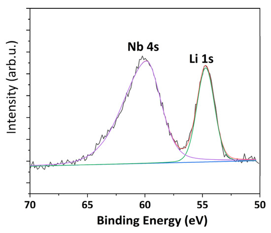 XPS quantitative analysis confirms a stoichiometric ratio of Li/Nb close to 1:1. The accuracy of XPS in Li concentration was found to be 20% [71]. The presence of C is attributed to adventitious contamination, while the low percentage of F suggests some fluorine contamination from the β-diketonate ligands (as shown in Table 3). In the region reported in Figure 6, we observe the presence of Nb 4s at 60.2 eV and Li 1s at 54.7 eV, in accordance with literature data [40]. For the quantitative evaluation, a Gaussian shape was used for the Li 1s peak, while an asymmetric Gaussian–Lorentzian shape was used for the Nb 4s peak [72,73]. The sample survey spectrum and spectra of additional elements that form the LiNbO3 phase are reported in Figure S2a and Figure S2b, respectively.