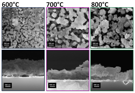 The morphology of the samples deposited at various temperatures has been examined using FE-SEM microscopy, as illustrated in Figure 7. The observed morphology exhibits characteristic features consistent with sol–gel deposition, displaying a highly wrinkled structure accompanied by small-sized grains. However, as the temperature is increased, a significant transformation becomes evident. In fact, upon increasing the temperature from 600 °C to 800 °C, a noticeable increase in crystallinity becomes apparent in the morphology of the LN films deposited on Si substrate: the individual grains become more distinct and well-defined, leading to a crystallinity enhancement in the overall surface structure. Specifically, the grains exhibit a pronounced increase in both granularity and definition: at 600 °C, rounded grains of the order of 100 nm are observed; at 700 °C more defined grains with dimensions around 200–300 nm are found; while at 800 °C, the film shows cubic grains ranging from 200 to 500 nm.