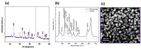 The XRD pattern (Figure 8a) reveals distinct reflections associated with the polycrystalline nature of the LiNbO3 phase, alongside some small peaks at 21.60°, 24.60°, 30.25°, 35,80°, and 38.10°, indicated with red stars that could be attributed to the LiNb3O8 phase (ICDD PDF no. 075-2154). Raman spectroscopy analysis conducted on the sample (Figure 8b) confirms the presence of the LiNbO3 phase as well, as evidenced by the presence of characteristic modes associated with this phase. The shift of Raman modes related to the strong presence of the quasi-/oblique modes are due to the local texture of the grains.