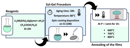 The sol–gel reaction occurred in the ethanol/water solution of “Li2Nb(hfa)7•diglyme•xH2O” single precursor. For the sol hydrolysis, the following molar ratio of precursor, solvent and catalyst was used: “Li2Nb(hfa)7•diglyme•xH2O”/87 C2H5OH/3H2O/0.8 CF3COOH. The sol was spin-coated on 1 cm × 1 cm Si (100) substrates after stirring it at 60 °C for 20 h. A SPIN-150 spin-coater (SPS Europe, Putten, The Netherlands) was used to perform the spin-coating operation with an acceleration of 1000 RPM/sec and a speed of 3000 RPM (revolutions per minute). In more detail, the sample was heated in air for 10 min at 350 °C after each 60 s spin of 0.2 mL of the gel on the substrate. A final annealing procedure at temperatures between 600 °C and 800 °C was carried out for one hour in air. A computer-controlled hardware setup and K-type thermocouples with a ±1 °C precision was used to monitor the temperature during the whole heating procedure.