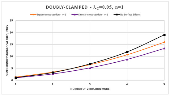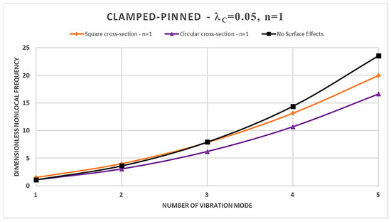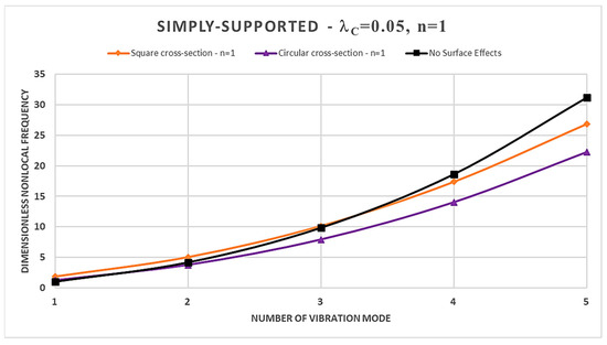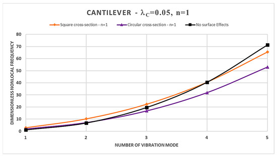- In the case of a square cross-section, the presence of surface effects results in additional stiffness, leading to an increase in the dimensionless normalized nonlocal frequencies for the first three vibration modes compared to the model without surface effects; however, the surface energy causes a reduction in dimensionless nonlocal frequencies for the fourth and fifth vibration modes;