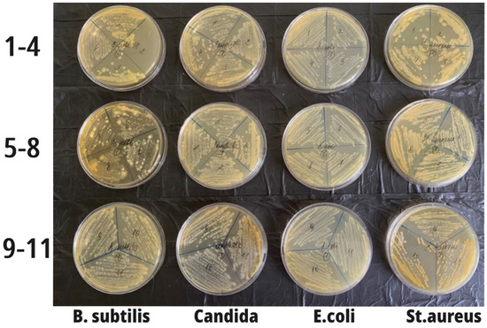 The growth of microorganisms in all Petri dishes. In the lower samples (the least concentrated and 11—the control), the growth intensity was maximum (on the left in the figure are samples with B. subtilis; in sector 2, there was almost complete inhibition of bacilli growth; in samples 3–7, the growth intensity was less pronounced compared to the control). The second row contained Candida, and growth inhibition was visualized in sectors 4–5. E. coli growth was reduced in sectors 2–3, and in St. aureus, growth was reduced in sectors 1–3.