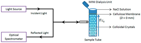 The experiments were conducted at 25 ± 2 °C in an air-conditioned room. In a typical procedure, the liquid colloidal crystals that were formed in a salt-free condition were transferred to the sample tube, and then one of the Dialysis Units was inserted into the tube, followed by the addition of a salt solution with the desired concentration. Special attention should be paid to make sure that there is gentle but sufficient contact between the colloidal crystals and the salt solution. Because of the low MWCO of the membrane, the colloidal particles cannot pass the membrane into the salt solution, but salt can diffuse into the crystal region. The connection between the sample tube and the Dialysis Units was sealed with laboratory film (PARAFILM, Chicago, IL, USA) to avoid both contamination with airborne CO2 and the evaporation of water. Through diffusion, the salt gradients () were established gradually throughout the sample tube, and the lattice constant variations induced by the salt diffusion were measured in situ by a reflection spectroscopy. The beam size was about 1 mm, and the penetration depth was basically near the wall. To check whether there was any temperature change in the vicinity of the beam, a temperature detector was placed at the optical fiber head. It was found that the temperature variation was smaller than 0.5 °C within two hours, so the heating effect on the sample can be ignored.