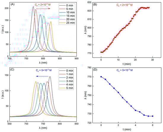 Reflection spectra and the corresponding peak wavelengths of the colloidal crystals during the diffusion of the salt solution with different concentrations. (A,B) Cs = 2 × 10−4 M, and (C,D) Cs = 5 × 10−3 M.