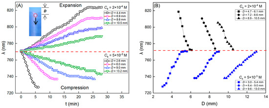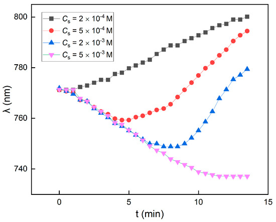 Peak wavelength variations in different Cs. Under low and high Cs (2 × 10−4 M, 5 × 10−3 M), the variations are monotonous, while in moderate Cs (5 × 10−4 M, 2 × 10−3 M), the variations transitioned from compression to expansion.