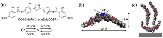 The synthesis of OC4-2MePh(mono2MeODBP) has been described elsewhere [39]. Its chemical structure, typical dimensions in the fully extended configuration and mesophase diagram are shown in Figure 2a,b.