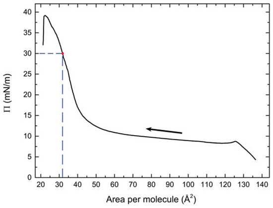 Langmuir films of OC4-2MePh(mono2MeODBP) over water were prepared in a NIMA Langmuir–Pockels trough equipped with control barriers (NIMA Technology Ltd., Coventry, UK). A 0.1 mg/mL solution of OC4-2MePh(mono2MeODBP) in chloroform was spread over pure water (resistivity of 18.2 MΩ/cm); the latter was obtained from an ELGA PURELAB Flex water purification system (ELGA LabWater, Wycombe, UK). After the evaporation of the solvent, the film was compressed by closing the control barriers at a constant rate of 70 cm2/min from an initial area per molecule of A ≈ 130 Å2. Compression isotherms (surface pressure Π vs. area per molecule APM) were measured using a Wilhelmy plate pressure sensor.