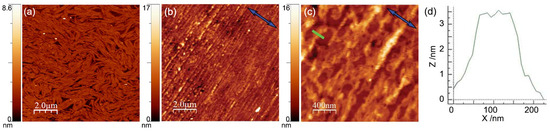 Aiming to obtain more uniform coverage of the substrate and, above all, more ordered packing of the molecules, for the present work, we chose a higher deposition pressure of 30 mN/m, corresponding to an area per molecule of ~32 Å2. To investigate the effect of the large deposition pressure on the film morphology, a single LB deposition on silicon was examined by AFM (Figure 6b–d). The difference with films deposited at Π = 12 mN/m is evident. The film became much more uniform; the fibrous meandering structure present in low-pressure samples was replaced by a dense sequence of parallel grooves, homogenously aligned along the direction perpendicular to the dipping direction c (Figure 6b,c). These undulations had widths of ~100 nm and depths of ~3 nm (Figure 6d), values quite similar to those observed in samples deposited at lower pressure. Clearly, the higher deposition pressure resulted in a more ordered mesoscale structure, characterized by an in-plane anisotropy extending uniformly over the sample surface.