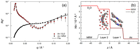 Measurements were performed in two different contrasts (sub-phases) to ensure maximum sensitivity to the layer adsorbed at the interface. While the use of null-reflecting water (NRW) is particularly sensitive to the adsorbed amount at the interface, the use of D2O enables the resolution of the interfacial structure.