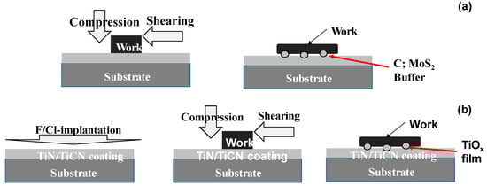 A schematic view of two types of solid lubrication mechanisms for dry metal forming and machining. (a) Solid lubricating coatings with molybdenum di-sulfide (MoS2) and carbon (C) to form the MoS2 or carbon agglomerates in situ, isolated from coating during compression and sliding [5,6], and (b) in situ lubrication by the synthesized tribofilms of intermediate titanium oxide (TiOx; 1 < x < 2) from the F/Cl implanted TiN/TiCN coating [7,8].