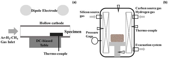 Thick SiC coatings were highlighted in the literature [19,20]. Among them, a thermal CVD system (Shinko-Seiki, Co., Ltd.; Kobe, Japan) was used to achieve carbon supersaturation to the co-deposited βSiC coating onto the SiC die substrate by controlling the carbon source gas flow rate. As illustrated in Figure 3b, a sintered SiC block with an average porosity of 0.5% was prepared as a substrate to make a thick SiC coating via the thermal CVD process at 1500 K for 108 ks. Silicon chloride and methane gases were selected as the silicon and carbon sources, respectively. They were mixed with hydrogen gas and introduced using a flow rate of 500 mL/min to the thermal reactor in the present CVD system. The thickness of the βSiC coating was 4 mm. After cooling down in an inert gas atmosphere, the βSiC-coated SiC block was directly cut using a diamond saw and polished using chemical buffing to shape the SiC-coated SiC punch and die. An overview of thermal CVD system is depicted in Figure 4b.