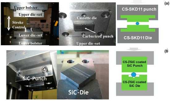 A CNC (computer numerical control)-stamping system (Hoden Seimitsu; Kanagawa, Japan) was employed for the upsetting experiments with the use of two different CS die pairs. The CS-SKD11 punch and die were fixed into the upper and lower cassette die sets, respectively, as depicted in Figure 5a. Those two die sets were cemented to the upper and lower bolsters of the CNC-stamping system with stroke control capability. The stroke was controlled by moving down the upper bolster to the specified position for reduction in thickness in work materials. The loading speed was constant at 10 mm/s. In a similar manner, the CS-βSiC-coated SiC punch and die were setup in the CNC stamper, as shown in Figure 5b. In both experiments, the load cell was embedded into the lower die set to monitor the variation in applied load by controlling the stroke.