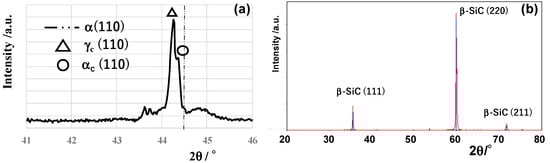 XRD diagram for CS-SKD11 die and CS-βSiC die. (a) XRD diagram of CS-SKD11 die in narrow 2θ range, and (b) XRD diagram of CS-βSiC die in wide 2θ range.