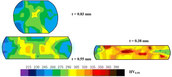 Figure 9 depicts the variation in work cross-sections and hardness maps with increasing r. Each hardness was measured pointwise with a distance of 0.1 mm. The measured data were edited and transformed into the colored contour diagram in Figure 9. Because the center part of the titanium wire is kept in compression during upsetting, higher hardness is measured irrespective of r. Except for these high hardness spots, the hardening process homogeneously advances with r across the whole cross-sections. No plastic localization was observed, even at r = 70%, which is different from the shear-band formation in [24] during the upsetting of wire- and disc-work specimens. This reveals that low friction on the contact interface results in significant suppression of work hardening by using the CS dies. It should be noticed that the upset titanium is shaped symmetrically with respect to the upper to lower halves and the right-hand to left-hand sides. This also implies that the titanium work flows homogeneously with low frictions on both interfaces of the CS punch and CS die to the work.