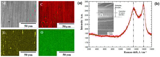 SEM-EDX analysis was used to describe the microstructure and element mapping on these interfaces after continuously upsetting the titanium wires in twenty strokes by 70% in reduction, as shown in Figure 10a. In the SEM image at the center of the contact interface, white stripes were formed in a vertical direction from the centerline of the contact interface. On the Ti-mapping, a few linear deposits with a width of 2 μm were scarcely seen without correspondence to the white stripes in the SEM image. These white stripes were just in agreement with the carbon stripes in a vertical direction on the contact interface. That is, the carbon tribofilm with a fine stripe width and pitch of 1 μm, is formed in situ on the contact interface and aligned in the plastic flow directions during upsetting. Raman spectroscopy was also utilized to analyze the deposits on the interface. As shown in Figure 10b, no peaks were present in the wave number range from 100 cm−1 to 1000 cm−1. That is, no titanium oxides and carbides were synthesized on the contact interface; no debris particles were yielded on the contact interface. Only two significant peaks were detected at 1320 cm−1 and 1600 cm−1, respectively, corresponding to the Raman spectrum measured for the amorphous carbon in [26]. That is, an amorphous carbon tribofilm is formed in situ on the contact interface.