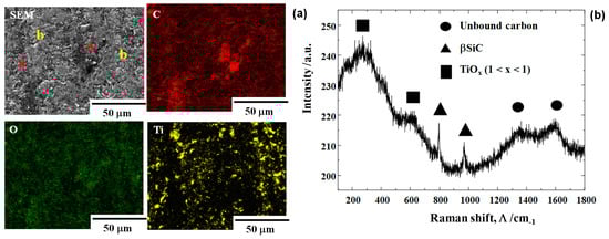 Microstructural analysis at the hot spots on the contact interface of the βSiC die and the titanium bar. (a) SEM image and element mapping by EDX and (b) Raman spectrum.