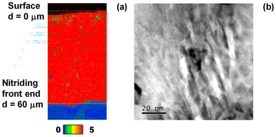 Let us discuss the mechanism in Figure 2 using EBSD (electron back-scattering diffraction) and STEM (scanning transmission electron microscopy) with reference to several studies in the literature. Theoretical study using the first-principles calculation demonstrated the equivalence between nitrogen supersaturation (NS) and carbon supersaturation (CS) processes involving irons [29]. The α-iron supercell lattice expands itself through occupation of its octahedral vacancy site by supersaturated interstitial solute. The carbon or nitrogen solute attracts its surrounding iron atoms to modify the electric structure of iron. These are common to two supersaturation processes. This equivalence is also experimentally validated in [30]. The peak shift of α-iron to lower 2θ by nitrogen and carbon supersaturation is observed by precise XRD analysis. The improvement of corrosion resistance by NS stainless steels is explained by the change in electric structure by solute supersaturation. Using these experimental results on the precise analyses on the NS stainless steels and tool steels, let us describe the role of interstitial-induced nanostructure to drive the isolation and diffusion of free-carbon atoms from the CS dies. Then, the effect of carbon interstitial supersaturation on microstructure evolution is explained by microstructure analysis of the nitrogen supersaturated dies.