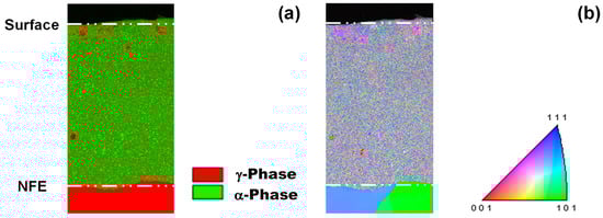 Phase mapping and inverse pole figure of NS layer analyzed by EBSD. (a) Phase mapping, and (b) inverse pole figure map.