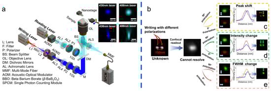 where the ratio of the maximum (β = α) to the minimum (β = α ± 90°) of the Iα is defined as κ, which is determined by the polarization-selective feature of the materials; Ird is the PSF of the reading beam. The reflectivity of these two points at 0° and 90° reading polarizations can be described as I00° = I1(β1 − 0°) + I2(β2 − 0°) and I90° = I1(β1 − 90°) + I2(β2 − 90°), respectively. Therefore, the variation between I00° and I90° is determined by the polarizations β1 and β2 of the writing beams [38,39,40,41]. Consequently, we can demodulate the unknown recorded polarizations by comparing the variation between I00° and I90°, as shown in Figure 1a. The variations mainly include three types: (1) peak shift, when there is a peak position shift between I00° and I90° while the peak values of I00° and I90° are almost equal, it demodulates the recorded polarizations to 0° and 90°, as shown in Figure 1c; (2) reflectivity change, when the detected peaks of I00° and I90° have large differences; however, without the change of peak shift and full width at half maximum (FWHM) of I00° and I90° (FWHMs are the same as the type (1)), it demodulates to 90° and 90°, as shown in Figure 1d; (3) FWHM change, when FWHMs of I00° and I90° are smaller than type (1), and the peak of the I00° and I90° have large differences, it demodulates to a space (nothing written) and 90°, as shown in Figure 1e. Due to the typical variation between I00° and I90°, it can completely demodulate the recorded polarizations within the diffraction limit.