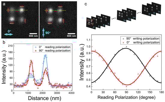 The principle of the sub-diffraction readout method based on polarization modulation is shown in Figure 1b. When we write on two adjacent data points spaced 150 nm apart with different polarizations (β1, β2), it is generally impossible to resolve the written information by confocal scanning due to the diffraction limit. To demodulate the recorded polarizations, we detect the written information with reading polarizations at α = 0° and α = 90°, respectively. Because of the linear dependence between absorption-induced reorientations with the intensity of the writing beam [35,37], the distribution of oriented molecules is proportional to the point spread function (PSF) Iwr(β) of the writing beam. Thus, the reflectivity Iα at different reading polarizations (α) can be described as the following:
