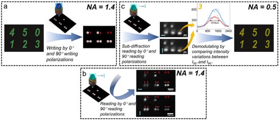 Based on the polarization-selective feature of DR 13, it remains challenging to write sub-100 nm data points with different polarizations in the thin film due to the lack of a sub-diffraction writing method. Therefore, we designed an experiment to demonstrate our sub-diffraction reading method as shown in Figure 3 The experiment includes two steps: (1) Writing process: writing different numbers on DR 13 thin film as in Figure 3a. Because of the diffraction limit, the smallest focal spot is expressed as r = 0.61 × λ/NA, where λ is the wavelength, and NA is the numerical aperture of the objective lens. We use a high NA objective lens (NA = 1.4, the smallest focal spot is about 190 nm) to write on two adjacent data points with a spacing of 500 nm. Then, we first read the written information with a high NA objective lens to confirm the accuracy of recorded polarizations Figure 3b. (2) Reading process: the written information cannot be resolved by using a low NA objective lens (NA = 0.5) directly because the diffraction limit is about 600 nm. Then, we used 0° and 90° polarizations to read the written information, and the variations of the reflected signal can be used to demodulate the corresponding numbers Figure 3c.