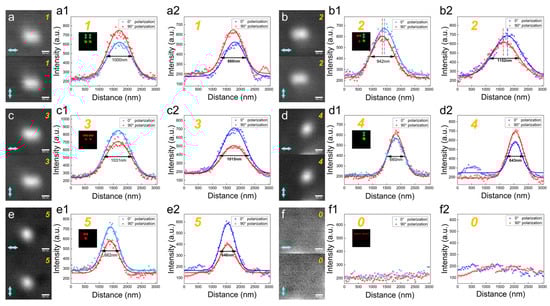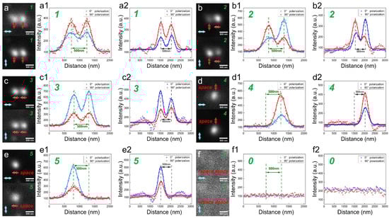 In the writing process, we wrote the numbers from 0 to 5 on two data points with a spacing of 500 nm. Considering the different responses of DR 13 thin film to polarizations of the writing beam, we used equal intensity of writing beams with different polarizations and only changed the exposure time to achieve diffraction-limited writing. When the exposure time of the writing beams (25.5 μWcm−2) at 0° and 90° polarization is 300 and 75 ms respectively, we can achieve nearly diffraction-limited writing. Then, to verify the accuracy of recorded polarizations, 0° and 90° polarizations of reading beams (20 nWcm−2) are utilized to read the written information using a high NA objective lens, and the specifically recorded polarizations and the variations between I00° and I90° are shown in Figure 4a–f. To evaluate the accuracy of the writing process with different polarizations, we used Equations (2) and (3) to simulate the reflected signal variations of the written information read by 0° and 90° polarizations; the results are shown in Figure 4(a2–f2). Among the simulations, Iwr and Ird are diffraction-limited PSFs of 436 nm and 488 nm, respectively. Gaussian white noise was introduced in Ird with an SNR (Signal to Noise Ratio) of 10, matched as the experiment condition. Compared to the variation of reflected signal in experiments, it reveals that the feature size of data points in the experiment is 330 nm Figure 4(d1) slightly larger than 285 nm Figure 4(d2) in our simulation. At the equal intensity of the reading beam, the maximum of the reflected signal under 0° and 90° writing polarizations are almost equal in Figure 4(b1), which is consistent with the simulation result in Figure 4(b2). The intensity varied ratio of the reflected signal I00° and I90° (I00°/I90°) in Figure 4(c1) is about 2.2, larger than 2 of the simulation in Figure 4(c2). However, the variation between I00° and I90° in the experiment, as shown in Figure 4(a1–f1), is still consistent with the simulation results in Figure 4(a2–f2). Therefore, this written information can be employed as a standard template for sub-diffraction readout with a low NA objective lens and Equations (2) and (3) can accurately describe the experimental process.