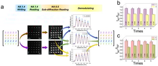 To measure the robustness and number error rate of the sub-diffraction readout method, we wrote a 5 × 5 numbers array by a high NA objective lens with a spacing of 1.5 μm, and read it by a low NA objective lens, as shown in Figure 6a. In the variations in the reflected signal, the primary difference is the peak value change in I00° and I90°. Therefore, we distinguished between 1 and 3 by comparing the ratio of I90° and I00° (I90°/I00°) to 1. As shown in Figure 6b, when the FWHMs of the reflected signals are approximately 1000 nm, and the I90°/I00° = 1.182 ± 0.032 > 1, they can be correctly decoded to 1; or the I90°/I00° = 0.786 ± 0.033 < 1, it is decoded to 3, as shown in Figure 6b. In the same way, as shown in Figure 6c, when the FWHM of the reflected signal is approximately 660 nm, and the I90°/I00° = 1.063 ± 0.045 > 1, it is decoded to 4; or the I90°/I00° = 0.787 ± 0.113 < 1, it is decoded to 5, as shown in Figure 6c. The obvious difference between I90°/I00° and 1 confirms that our method is robust. Therefore, all numbers have been demodulated correctly without any number errors, which verifies that the sub-diffraction readout method is reliable and repeatable.