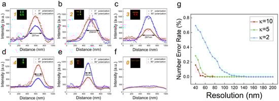 To further demonstrate the capability of the sub-diffraction readout method, we analyzed the important parameter of κ, which is the key to determining the resolution. Here, we introduced the number error rate to evaluate the impact of κ on the resolution, which is the minimum distance between the two adjacent data points that can be read out without any decoded number errors, as shown in Figure 7g. We found that the resolution increases with the κ values. Normally, the κ value depends on the polarization-selective feature of the storage mediums, for example, the κ of the azo-dye chromophores is 2 [43,44,45,46,47], for gold nanorods, it is nearly 5 [11,20], and for liquid crystal, it is more than 10 [48]. Therefore, for κ = 2, the resolution of the sub-diffraction method is 150 nm; when κ = 5, the resolution can achieve 90 nm, even up to 70 nm at κ = 10. Therefore, when polarization-selective material with a high κ value is chosen as the storage medium, the sub-diffraction method has the potential to achieve a resolution of 70 nm. When more than two adjacent data points are within the diffraction limit, our method still has the capability to read them out. Combining the 1.5-fold capacity improvement of the encoding method, our method has the potential to achieve a readout capacity approaching 1.1 PB in a DVD-sized disk.