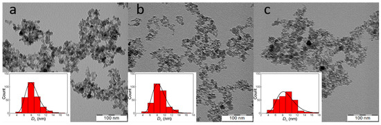 The IONs were synthesized by the precipitation of iron(II) and (III) chlorides with ammonium hydroxide, which is a frequently used method for the preparation of magnetic nanoparticles [26,30]. It is supposed that the resulting product consisted predominantly of magnetite, which is not very stable and may undergo uncontrolled oxidation to other forms of iron oxide, including non-magnetic hematite. In order to prevent the uncontrolled oxidation of magnetite, its controlled oxidation to maghemite using sodium hypochlorite was carried out. Such IONs have the advantage of superparamagnetism, which means that they respond to an external magnetic field but do not retain residual magnetism when the magnetic field is removed, and therefore do not agglomerate and are readily dispersible in aqueous media [31]. Superparamagnetism of IONs is then advantageously used in many biomedical applications [32]. The morphology of IONs in a dry state was investigated by TEM (Figure 1), which revealed particle aggregates formed during sample preparation involving drop casting and drying. The aggregates consisted of primary particles with a shape close to spherical, with an average size of Dn = 8 ± 2 nm and dispersity Ð = 1.29, indicating a moderately broad size distribution. In addition to TEM analysis of the dry particles, the aqueous dispersion of IONs was investigated by DLS, which revealed a hydrodynamic diameter Dh = 108 ± 1 nm and a polydispersity PD = 0.13. A larger Dh than Dn is common for ION colloids not only because of partial aggregation but also because the particles are surrounded by an electrical double layer and DLS measures an intensity-weighted z-average diameter sensitive to large objects. DLS is also used to measure the ξ-potential, which reached −26 ± 5 mV; the negative ξ-potential is typical for particles prepared by coprecipitation of FeCl2 and FeCl3 with a base [33]. Such a value of the ξ-potential ensures the colloidal stability of the IONs in water [34]. According to the TGA of neat IONs, 3.1 wt.% of the total weight loss could be attributed to the evaporation of residual water.